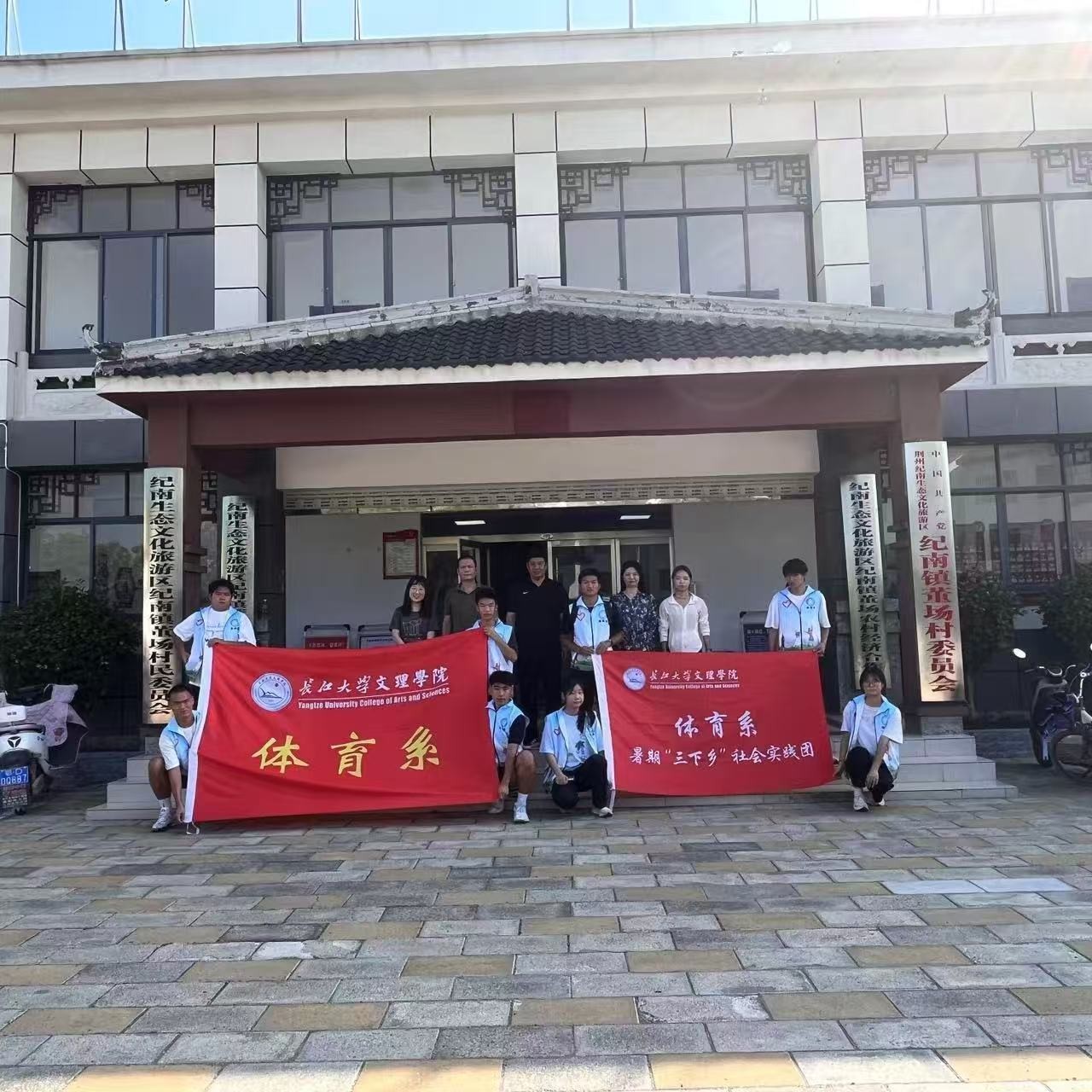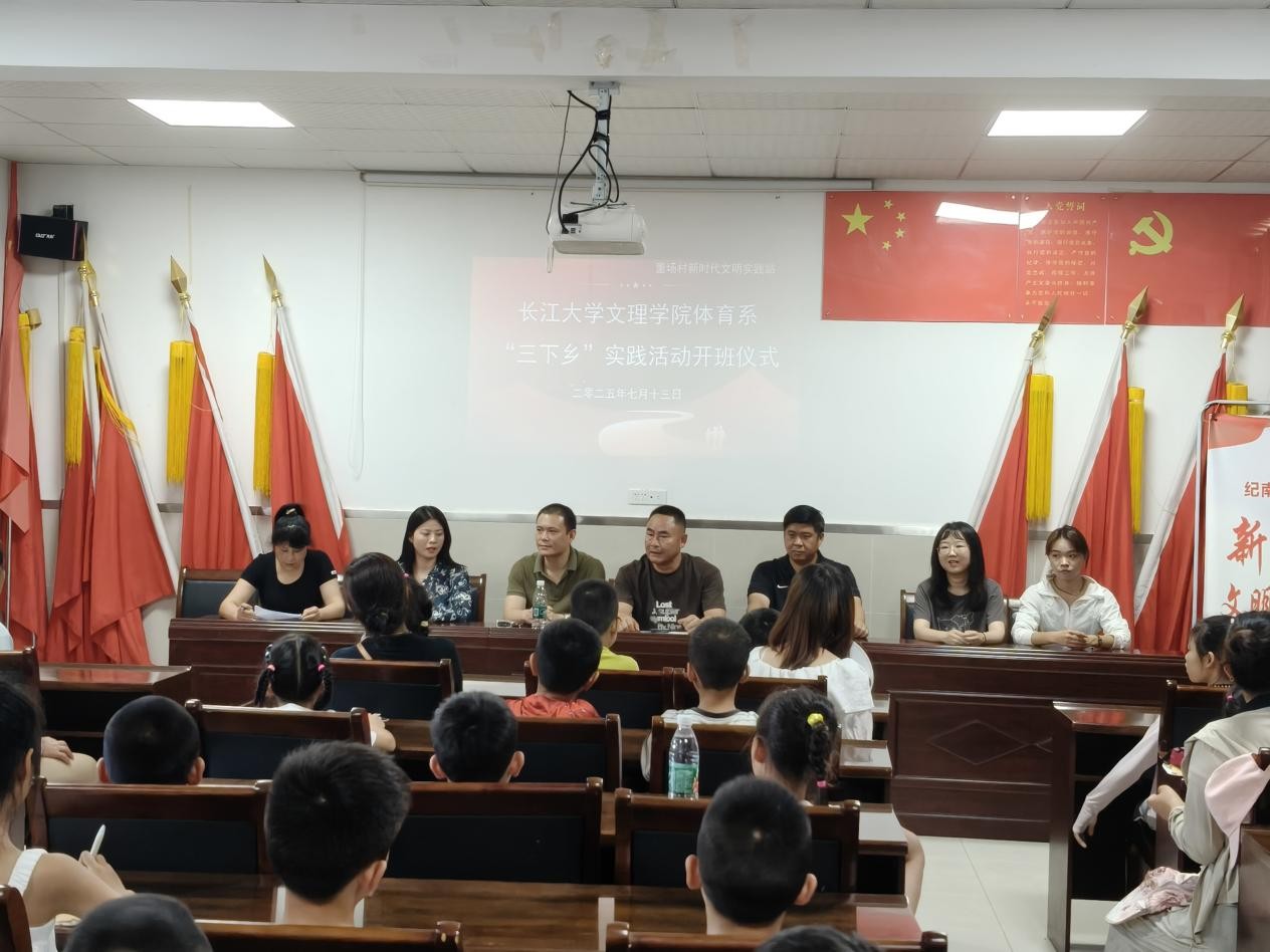 本网讯(通讯员 谭钰婷)2025年7月13日下午3点半,太阳集团tyc9728体育系“三下乡”暑期社会实践活动开班仪式在荆州市纪南文旅区董场村活动中心隆重举行。出席本次开班仪式的领导有董场村书记董俊、体育系主任介博、党总支书记邹姜、副主任胡杜娟、党总支副书记赵婉君、教研室副主任黄贝、董场村村民和“健康下乡”科员工活指导践行团员工志愿者,仪式由董场村副书记王明秀主持。