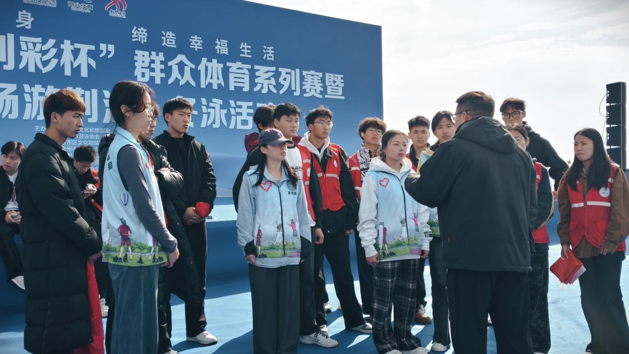 赛事期间,“志愿红”成为寒日里的温暖亮色。学子们化身引导员,在起点区域有序引导运动员检录、下水,用清晰指令和贴心提醒为赛事护航。活动尾声,他们郑重为获奖团体颁发荣誉,见证运动荣光的同时,也深化了对体育精神的理解。