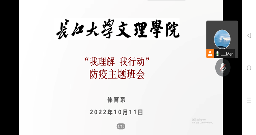 10月11日晚,体育系全体同学在当前正值疫情防控的关键时期开展“我理解,我行动”防疫主题班会,以腾讯会议视频通话的形式展开。在辅导员门世豪的主持召开下,此次班会顺利完成。