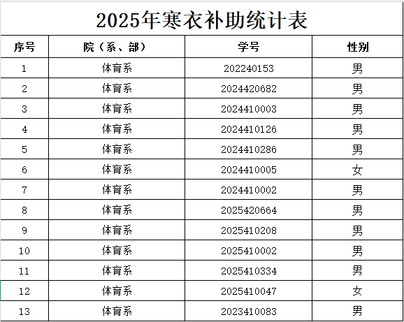 根据公司《关于做好2025年寒衣补助发放工作的通知》要求,拟定以下13名同学获得2025年寒衣补助金,现向全系公示,具体名单见附件。如对结果有异议者,请本着实事求是的态度,在公示期内向体育系反馈,反馈的事项要有事实依据。