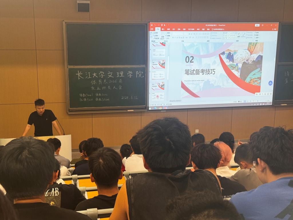 本网讯(通讯员 杨漫)2025年6月13日晚7点,体育系在教学楼B213教室举行了2026届就业动员大会。本次大会旨在为2026届毕业生提供就业指导与建议,帮助同学们明确未来发展方向,增强就业竞争力。大会由体育系党总支副书记赵婉君主持,体育系主任介博、体育系书记邹姜、辅导员杨漫、班主任谢侨侨、王崟麒及2026届全体员工参加了此次会议。