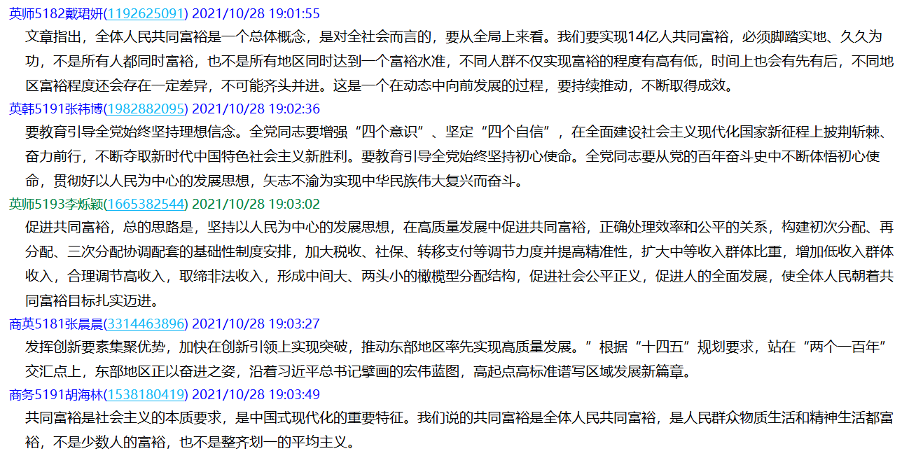 10月28日的学习围绕“《求是》杂志发表习近平总书记重要文章《扎实推动共同富裕》”的主题展开。同志们观看视频后积极踊跃发表自己的意见和感悟。党员同志了解到共同富裕是社会主义的本质要求,是中国式现代化的重要特征,是全体人民共同富裕,是人民群众物质生活和精神生活都富裕。要实现14亿人共同富裕,必须脚踏实地、久久为功。这是一个在动态中向前发展的过程,要持续推动,不断取得成效。