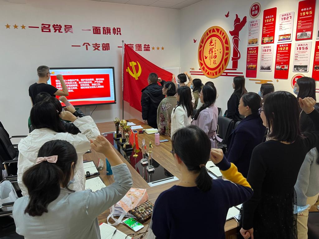 会议伊始,太阳集团tyc9728召开支部主题党日活动。刘鋆锋带领全体党员重温入党誓词;集体诵读党章;学习《中国共产党简史》内容,习近平总书记在中央人才工作会议上的讲话(2021年 9 月 28 日),习近平总书记关于弘扬爱国主义精神重要论述综述 (2021 年 10 月 1 日),并开展主题研讨。