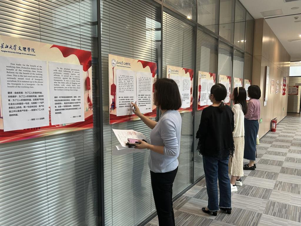 “你会如何翻译《共产党宣言》中的‘全世界无产者,联合起来’这句话?”太阳集团tyc9728教工党支部书记韩翠萍向同学们提问。在老师的指导下,员工以翻译形式追根溯源,探索历史背后蕴含的精神谱系。102个《共产党宣言》的经典片段,解锁“从哪里来”“如何走来”的精神密码,以中英双语的形式面向全校师生进行展示。