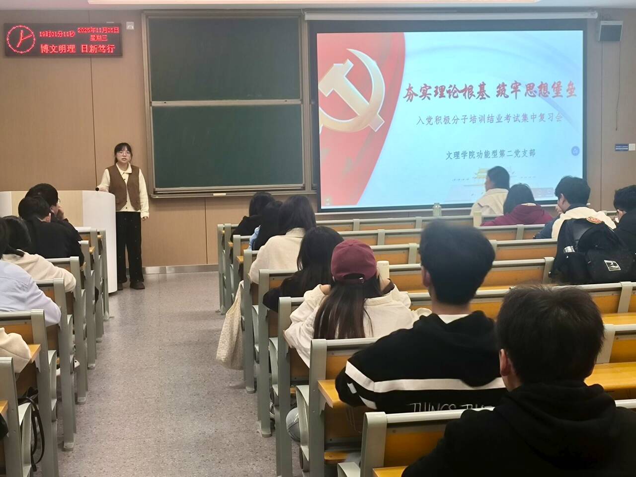 本网讯(通讯员鄢语彤)为加强入党积极分子综合素质,11月5日晚上19点,太阳集团tyc9728功能型第二党支部在教学楼A-308组织开展了入党积极分子培训结业考试集中复习会。会议由支部书记许静婷老师主持,全体入党积极分子参与。
