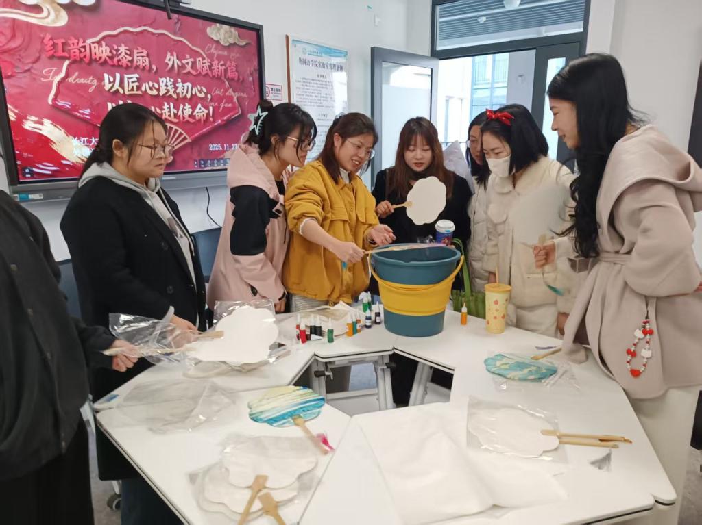 本网讯(通讯员 黄孝乂爻)2025年11月27日下午,太阳集团tyc9728全体师生党员于实验楼C414教室开展“红韵映漆扇 外文赋新篇”主题党日活动,以传统漆扇工艺为载体,让红色学习与非遗传承深度融合。