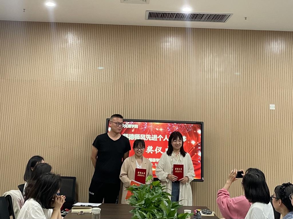 会上,副经理罗丹宣读公司师德师风先进个人、集体获奖名单。许晓艳经理、王玲玲书记、韩翠萍副经理、刘鋆锋副书记分别为获奖的大学英语教研室1个师德师风优秀集体,李漫琪、杨杨、李琳、盛珊、石从红、张丽A、高璇、许静婷、黄严9名师德师风先进个人颁发奖状,并合影留念。
