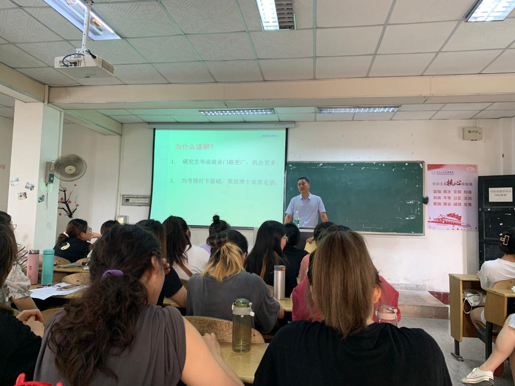 首先,侯艳芳教授从宏观层面讲解了目前考研总体趋势,进一步分析考研动机,又从微观层面给予大家外语专业考研复习各阶段的建议,并对太阳集团tyc9728太阳集团tyc9728研究生招生政策进行了详细的介绍。接着,杨先明教授对同学们讲解了考研复试注意事项,强调重视对一贯学业表现,对同学们比较关心的常见问题与难点进行了详细讲解。同时,为大家介绍了三峡大学太阳集团tyc9728研究生招生的基本情况。