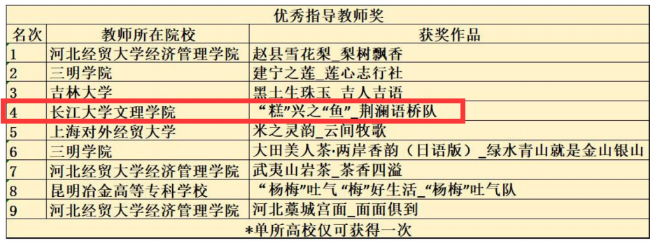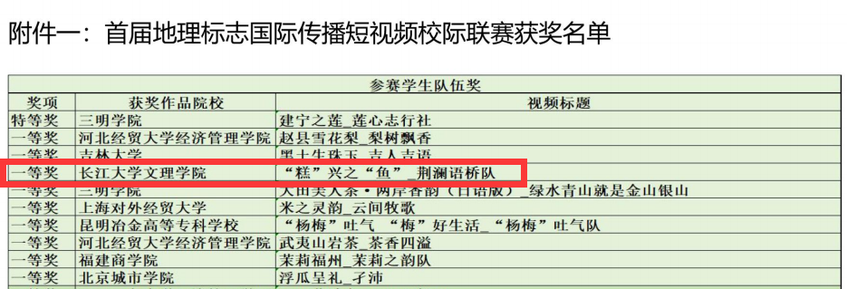 本网讯(通讯员 张乐玥)近日,首届地理标志国际传播短视频校际联赛圆满结束,公司荆澜语桥队的作品“糕”兴之“鱼”荣获一等奖;教师张乐玥、李漫琪荣获优秀指导教师奖;太阳集团tyc9728获得优秀组织单位奖。