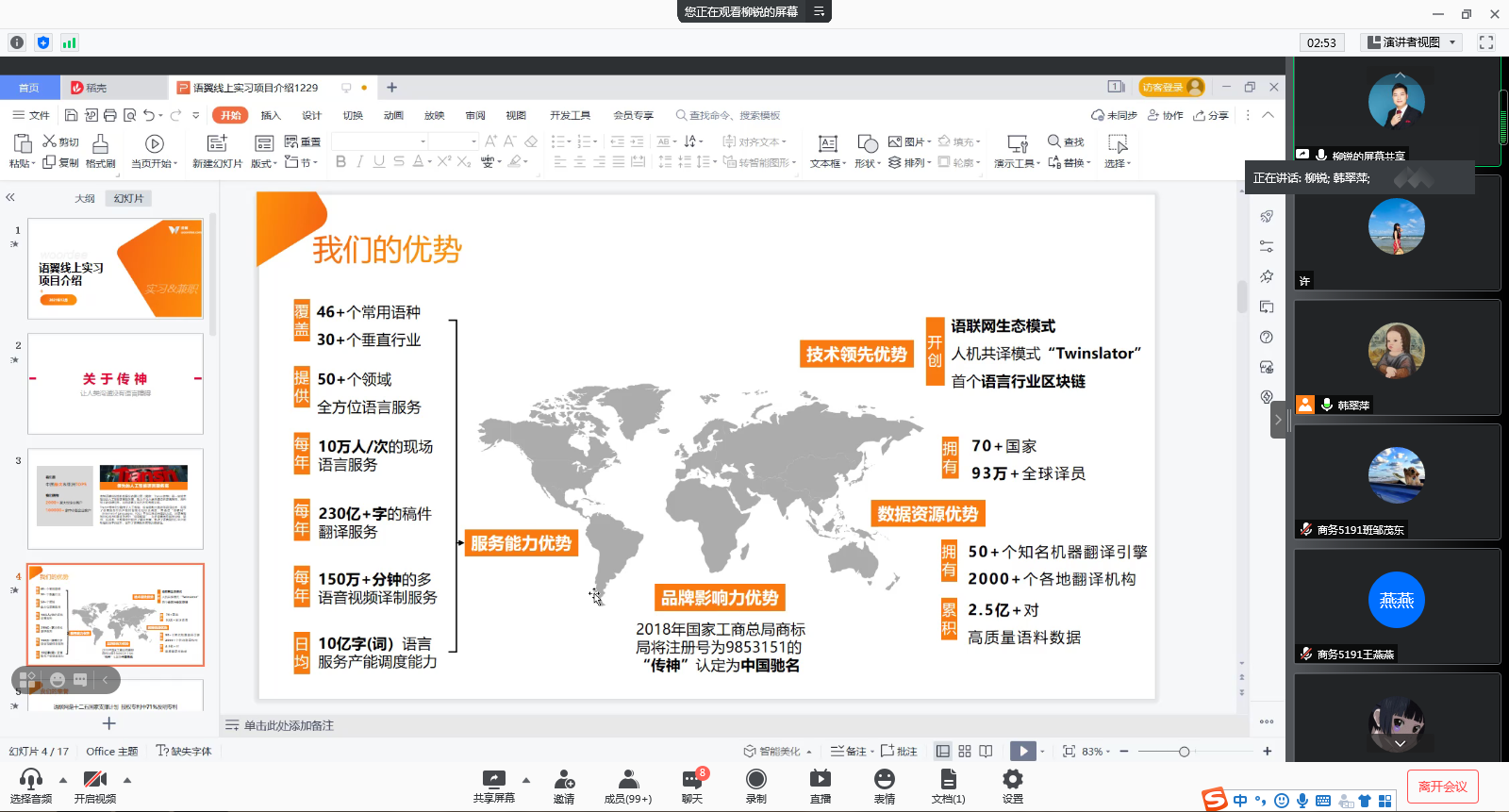 会上,传神公司湖北地区高校负责人在线介绍传神关于我们、语言服务业发展状况、信息化时代翻译行业发展趋势。传神语翼平台指导老师就本次实习项目的开展进行详细介绍,并推出“语翼”翻译平台,指导员工在翻译平台完成注册及测试,成为合格议员,顺利接收订单,并介绍了译员的工作流程。互动环节,公司相关负责人回答了同学们的提问。