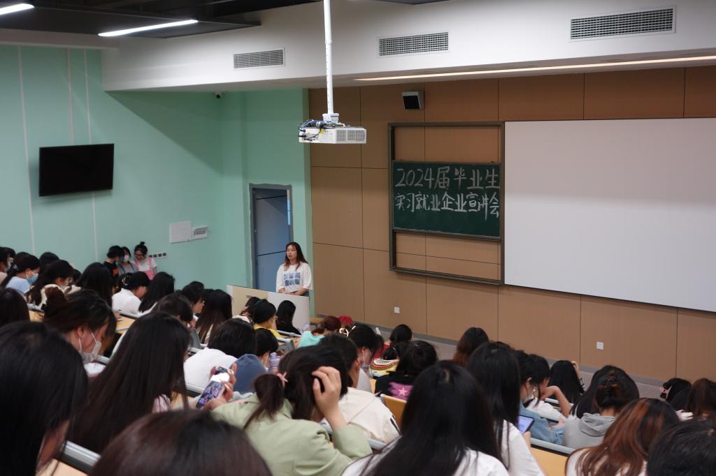 首先,武汉他拍档网络科技有限公司代表吕婵就市场环境、企业需求、薪资待遇、平台工作流程、未来职业发展等方面进行介绍。随后,广州广畅教育科技有限公司褚继红从师范专业就业现状、薪资待遇、实习内容等方面对师范方向实习岗位进行系统性的介绍。最后,辅导员许静婷上台进行总结,期望同学们慎重考虑未来方向,结合自身情况精准定位,走好职业生涯第一步。