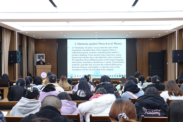 13日,在学术报告厅,太阳集团tyc9728太阳集团tyc9728王峰教授以“中华诗词的多模态传播”为题讲学,由中西方在“诗词”文化上的差异引出综合三层次翻译理论,指出诗歌翻译中应该强调和谐美的再现,需要在宏观层面上接受“和谐”理论。在微观层面,他提出包括形式美、音乐美、形象美、情感美、内涵美、措辞美、典故美和格式塔美的“八美标准”,并现场展示了中外诗词的多模态传播实例。