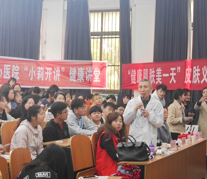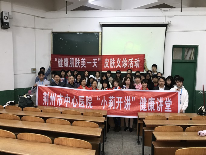 (通讯员黄茜)4月9日中午12点,外国语系在一教203举办皮肤义诊讲座。讲座由荆州市中心医院皮肤科主任孙毅和医师张丽主讲。荆州市中心医院皮肤科主任曾同祥、副主任柳兵、副主任医生邬清芝以及公司百余名员工参与该活动。