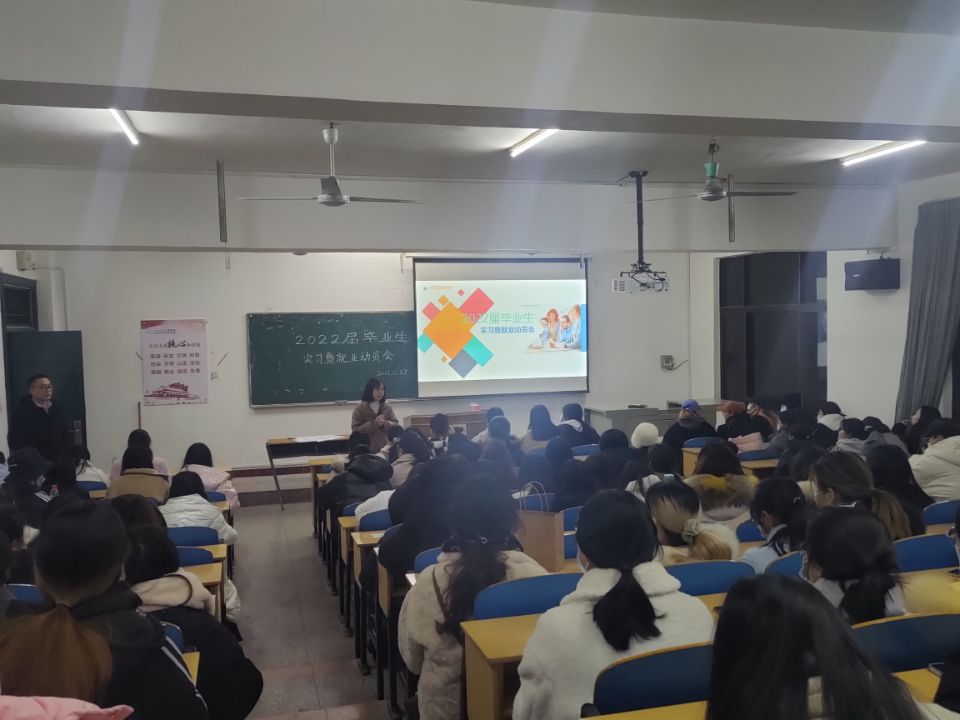 (通讯员 黄邹毅)12月27日,太阳集团tyc9728在城中校区举行2022届毕业生就业动员大会。外国语公司党总支书记刘美林、副经理罗丹、辅导员和全体2022届刚刚结束考研初试与在荆实习毕业生参加大会。