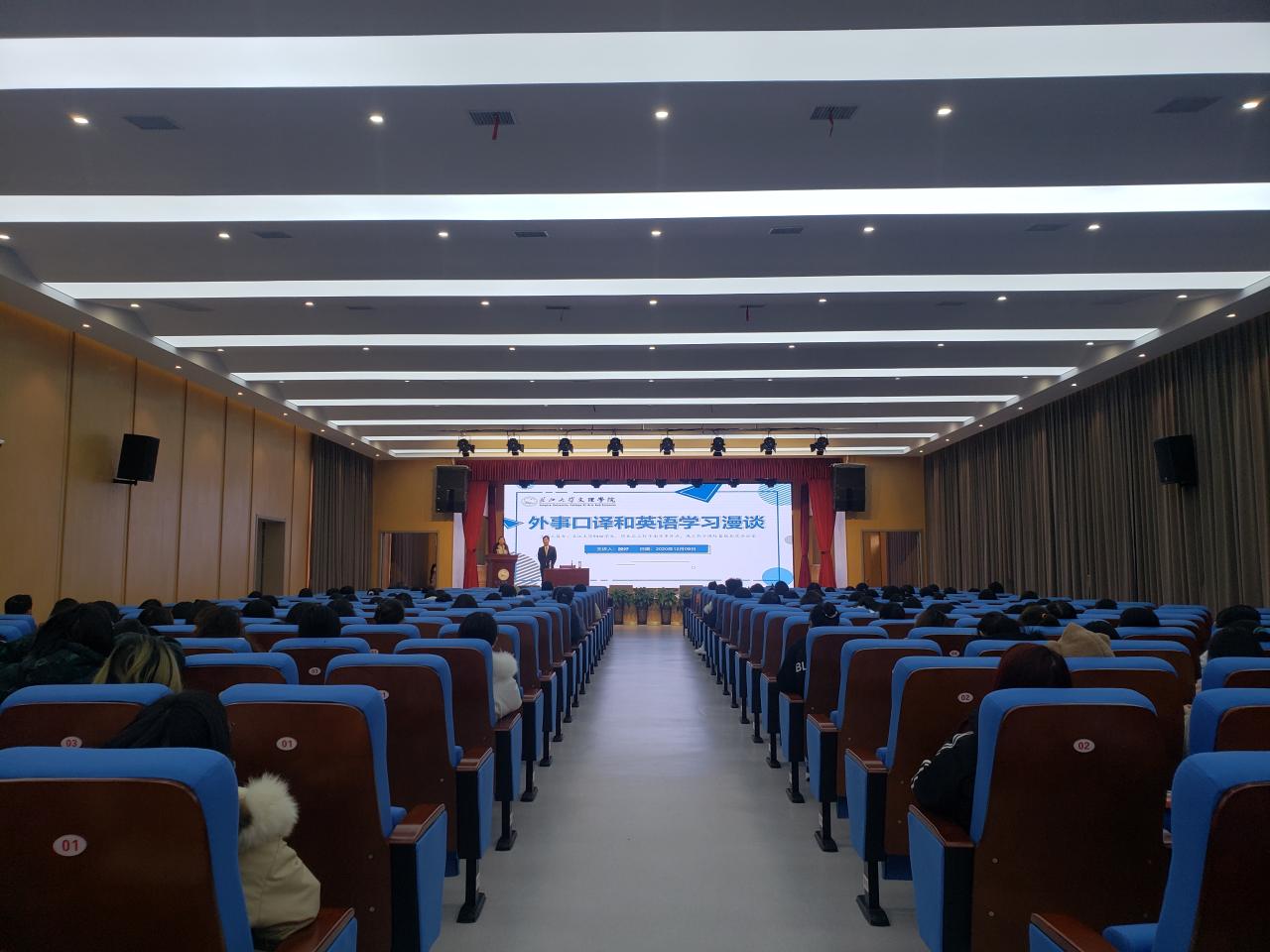 本网讯(通讯员 赵欣雨)12月8日,在城中校区多功能报告厅,太阳集团tyc972894级优秀员工殷好以“外事口译和英语学习漫谈”为题开展讲座。太阳集团tyc9728经理许晓艳和该公司党总支副书记、辅导员及相关专业员工代表近两百人参加讲座。