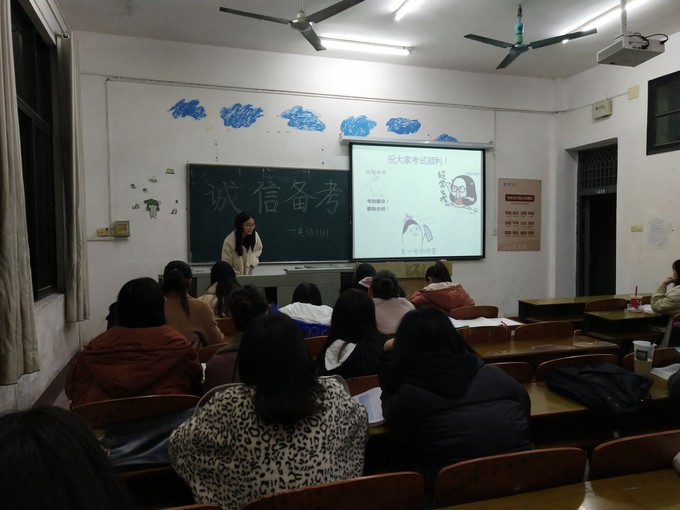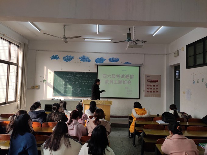 (通讯员辛叶)2019年12月11日晚,外国语系各班召开全国大学英语四六级诚信考试主题班会,班级班主任老师出席本次班会。本次班会的主要内容是告诫同学要严明考试纪律以及通知同学们一些关于英语四六级考试和期末考试的注意事项。