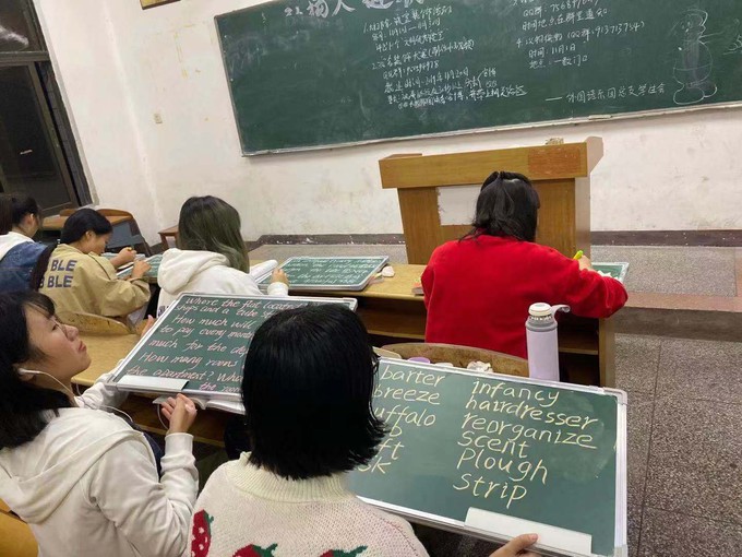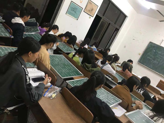 (通讯员拓颖)为促进英语师范生教学技能培养,进一步适应全国基础教育改革发展对团队培养的需求,加强师范生实践应用能力,外国语系开展英语师范生技能一体化专项训练活动,此次期中检查项目为英语师范生每天晚自习练习十五分钟黑板字。