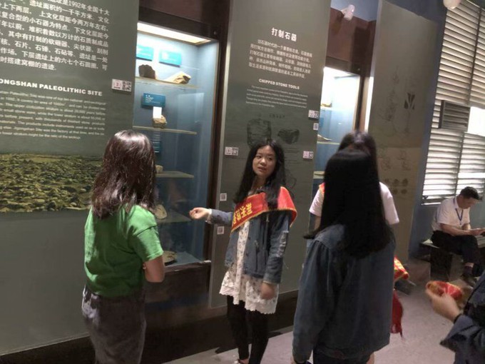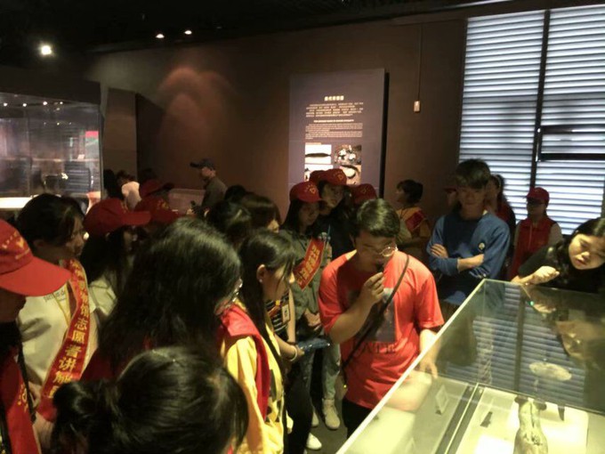 我们的志愿者们则主要负责搀扶老人以及为残疾人士展示文物复制品,其中储备手语知识的志愿者们负责给聋哑人引路。大家各司其职,相互配合。我们系收费讲解员来自商英5171的吴光阳也加入了志愿者讲解的队伍,在做好服务工作的同时也为讲解队伍减轻了负担。