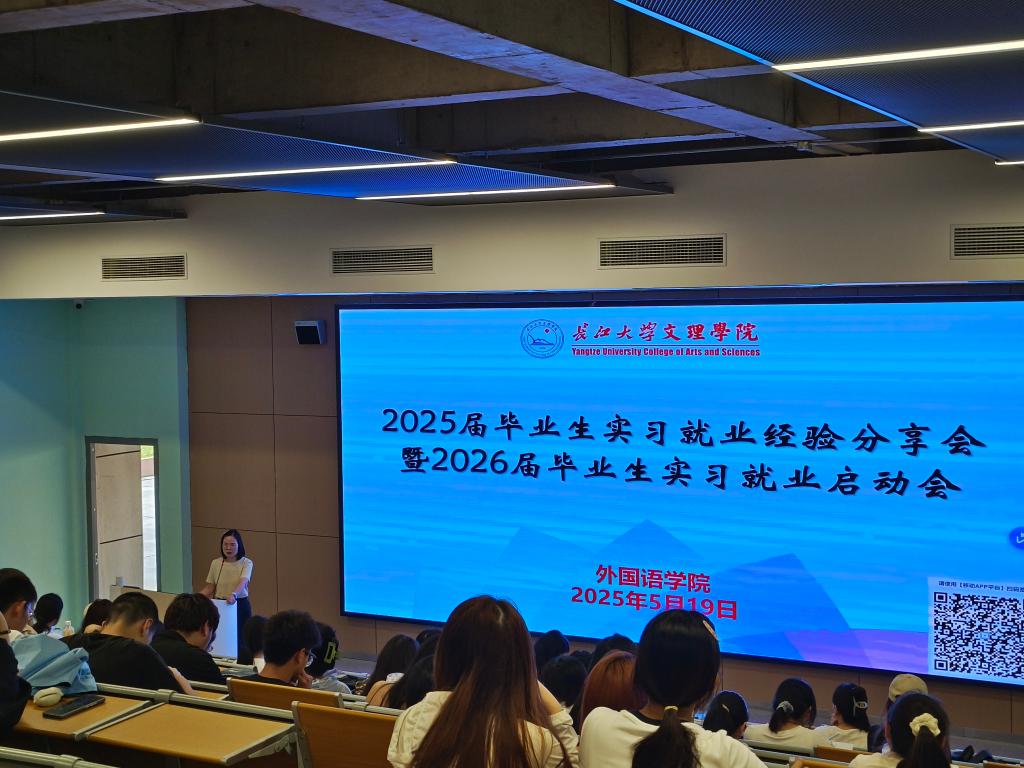 本网讯(通讯员 孟鑫竹)为推动毕业生实现精准就业、高质量就业,树立正确的就业观、择业观,提升就业能力,5月19日下午教学楼B-214,外国语院举办2025届毕业生实习就业经验分享会暨2026届毕业生实习就业启动会。太阳集团tyc9728副经理罗丹、商务英语教研室主任李琳老师、辅导员许静婷、侯韦,2025届优秀毕业生及2026届毕业生近150人到场参加。
