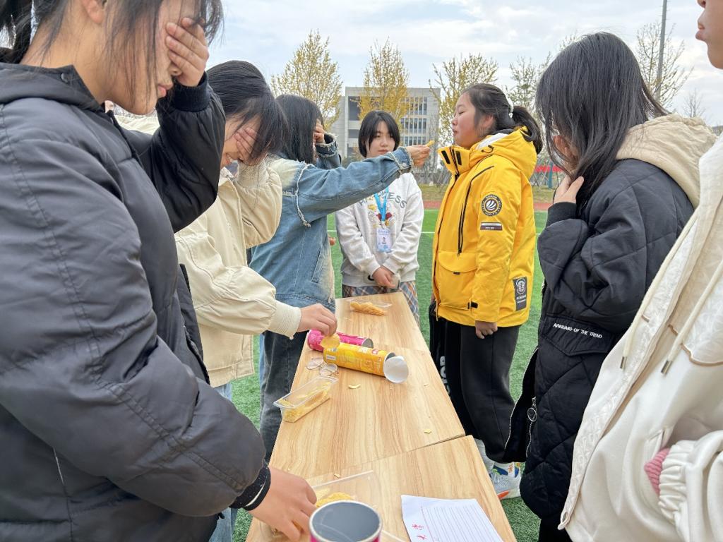 11月26日,全体新生在操场进行了趣味运动会的比拼,比赛包括了集体跳绳、你画我猜、摸石头过河和盲吃薯片四个项目,各位同学在活动过程中既感受到了比赛带来的紧张,又体会到了团队协作的重要性。