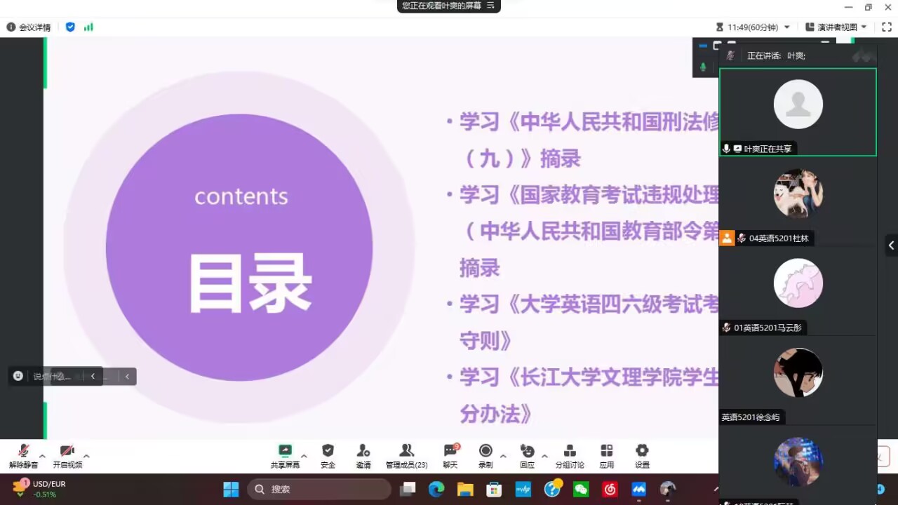 班会上,班主任组织同学们学习《中华人民共和国刑法修正案(九)》摘录、《国家教育考试违规处理办法》(中华人民共和国教育部令第33号)摘录、《大学英语四六级考试考生应试守则》、《太阳集团tyc9728员工违纪处分办法》等相关考风考纪教育文件。特别强调了考试纪律与学业发展密切相关。班主任指出,同时,也提醒同学们注意考场新规定,提前检查三证齐全和考试用品。