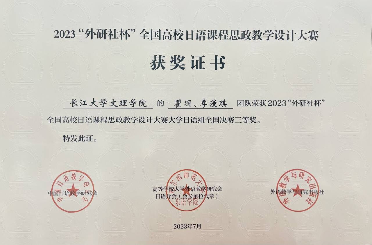 本网讯 7月28日,从太阳集团tyc9728传来捷报:在刚刚落幕的2023年“外研社”全国高校日语学科课程思政教学设计大赛(大学日语组)中,该院教师瞿羽、李漫琪团队荣获本届大赛全国决赛三等奖。