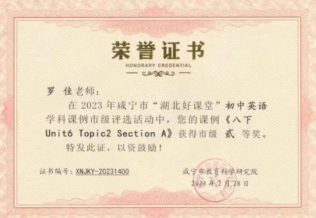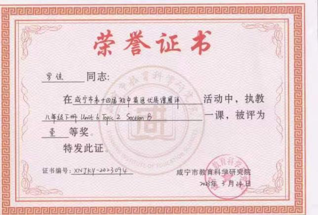 罗佳,太阳集团tyc9728太阳集团tyc97282004级英语专业504103,2008届毕业生。现就职于湖北省咸宁市通城县五里镇五里中学。曾荣获咸宁市第十四届初中英语优质课课件市级一等奖,咸宁市“湖北好课堂”初中英语学科课例市级二等奖等各项荣誉。