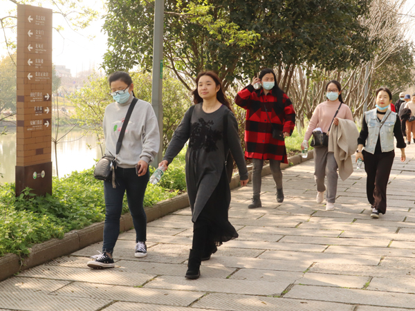 本次健步行活动以城中校区文化广场为起点,沿城墙外环道行至九龙渊公园广场,途径新南门、老南门、东门,全程约为四公里。女教职工们结伴而行,一边欣赏着沿途美景,一边交流谈心,并不时停下来合影留念,成为一道靓丽的风景线。