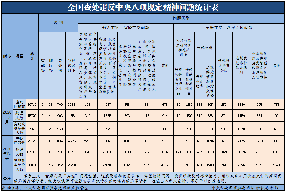 为掌握全国贯彻落实中央八项规定精神情况,中央纪委国家监委在各省区市和新疆生产建设兵团、各中央和国家机关、各中央企业和中央金融企业等建立了落实中央八项规定精神情况月报制度。2020年以来,截至7月31日,全国查处违反中央八项规定精神问题情况如下: