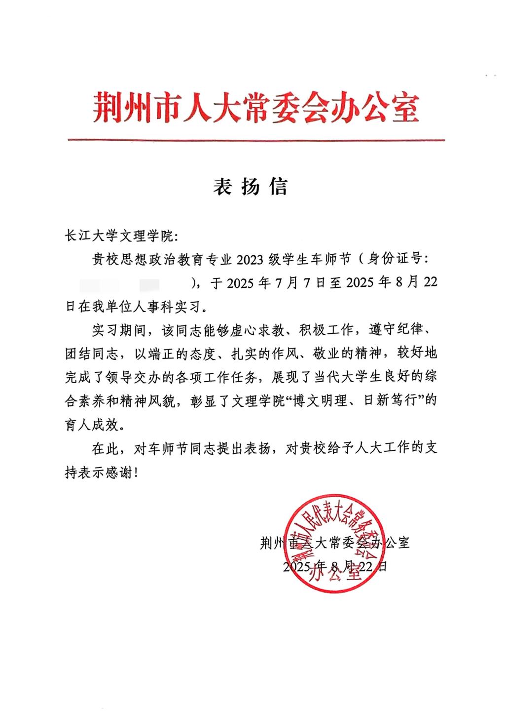 近日,荆州市人大常委会办公室向公司发来表扬信,对思想政治教育专业2023级员工车师节在单位人事科实习期间的优异表现提出表扬,同时也对公司给予人大工作的支持表示感谢。