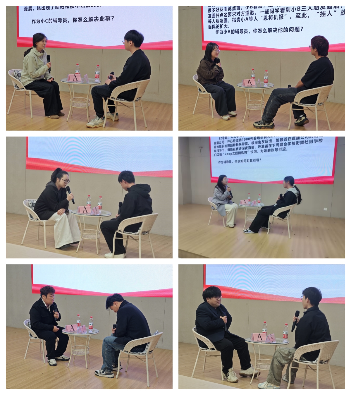 谈心谈话环节通过情景模拟真实员工工作中常见的困惑与矛盾,重点考察选手们问题定位、沟通技巧、解决问题等方面的综合能力。参赛辅导员与助演员工现场互动,围绕学业压力、人际矛盾、推优入党、心理困惑等典型情景展开深度谈心谈话。辅导员老师们以温柔的语言、大方得体的肢体动作、饱含温情的理性分析,在模拟场景中表现出了较好的沟通技巧和人文关怀。
