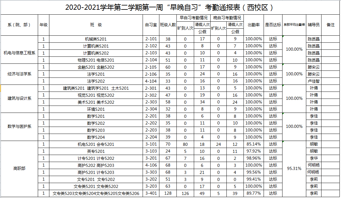 2020-2021学年第二学期第1周系(院、部)早晚自习考勤通报