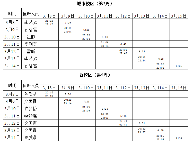 2020-2021学年第二学期第2周学工人员寝室值班通报