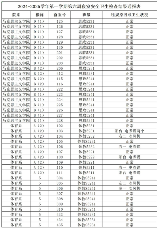 2024-2025学年第一学期第六周寝室安全卫生检查结果通报