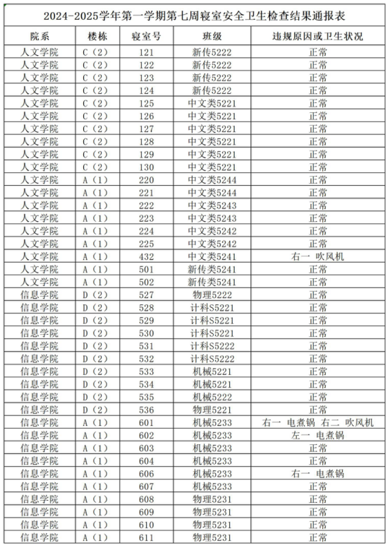 2024-2025学年第一学期第七周寝室安全卫生检查结果通报