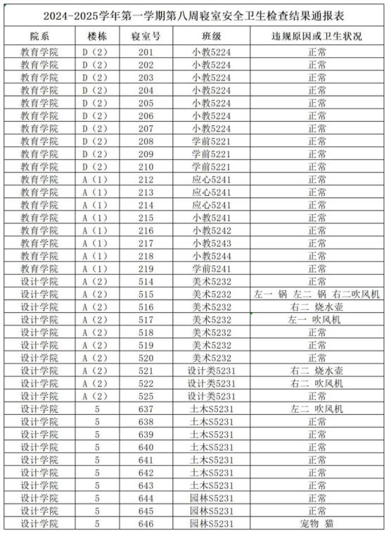 2024-2025学年第一学期第八周寝室安全卫生检查结果通报