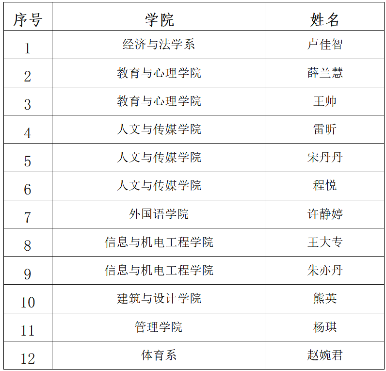 根据前期初赛开展的业务知识测试、育人故事撰写二个环节的比赛,依据综合成绩排名,以下12人晋级决赛(排名不分先后)。