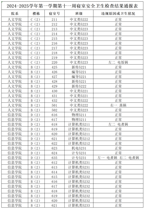 2024-2025学年第一学期第十一周寝室安全卫生检查结果通报
