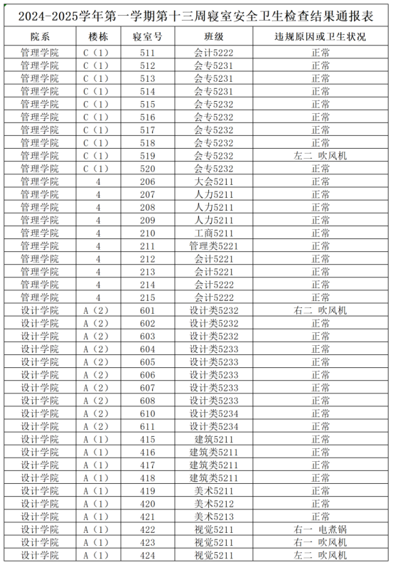 2024-2025学年第一学期第十三周寝室安全卫生检查结果通报