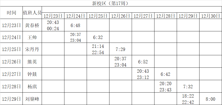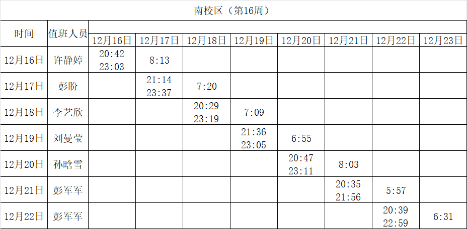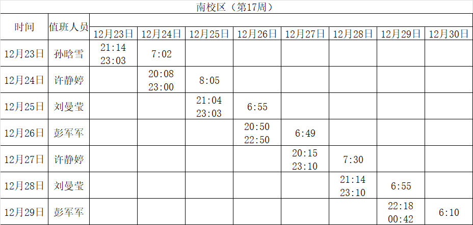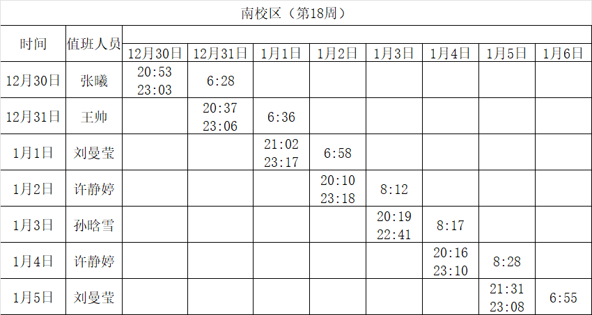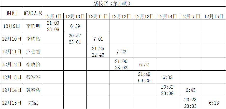 2024-2025学年第一学期第15-18周学工人员寝室值班通报