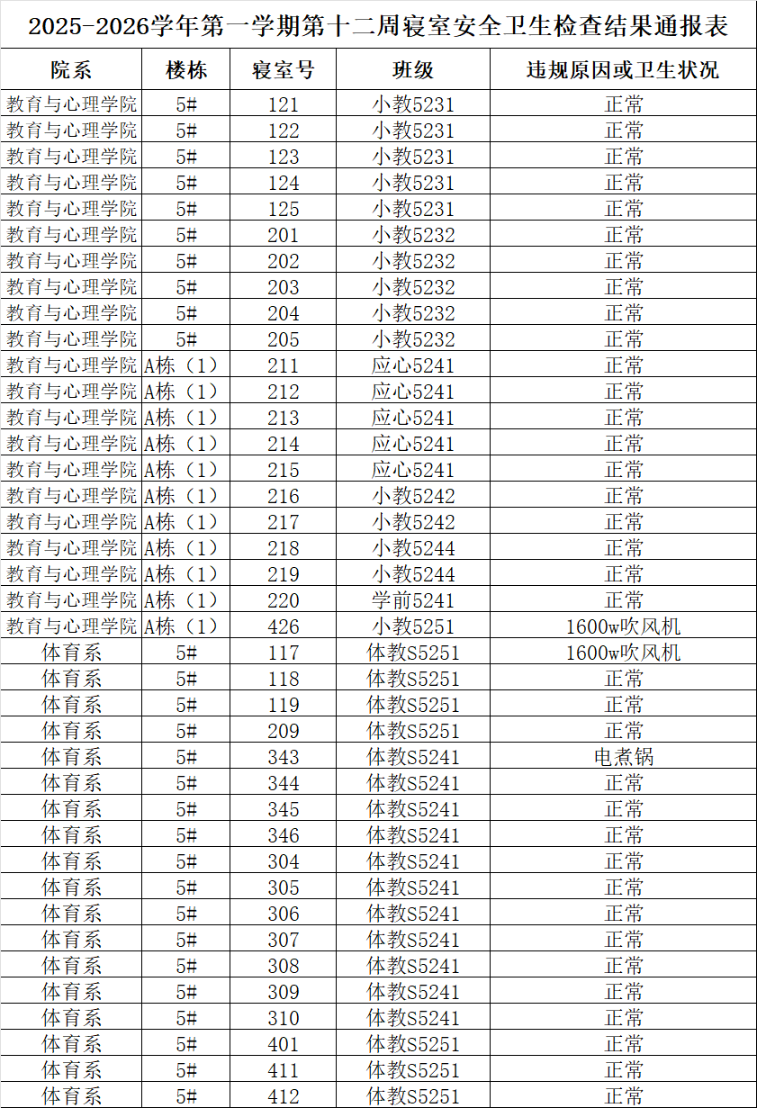2025-2026学年第一学期第十二周寝室安全卫生检查结果通报表