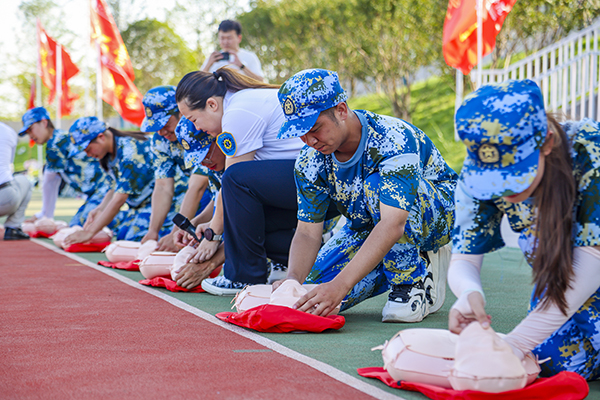 足球场上,穿着迷彩军训服的老员工们席地而坐,市急救中心培训师丁璐结合培训模型,通过分步骤、慢动作操作演示如何判断呼吸、心跳骤停、打开气道、人工呼吸、心肺复苏等急救法,一边详细讲解心肺复苏术的操作要点,一边进行标准化的师范操作。