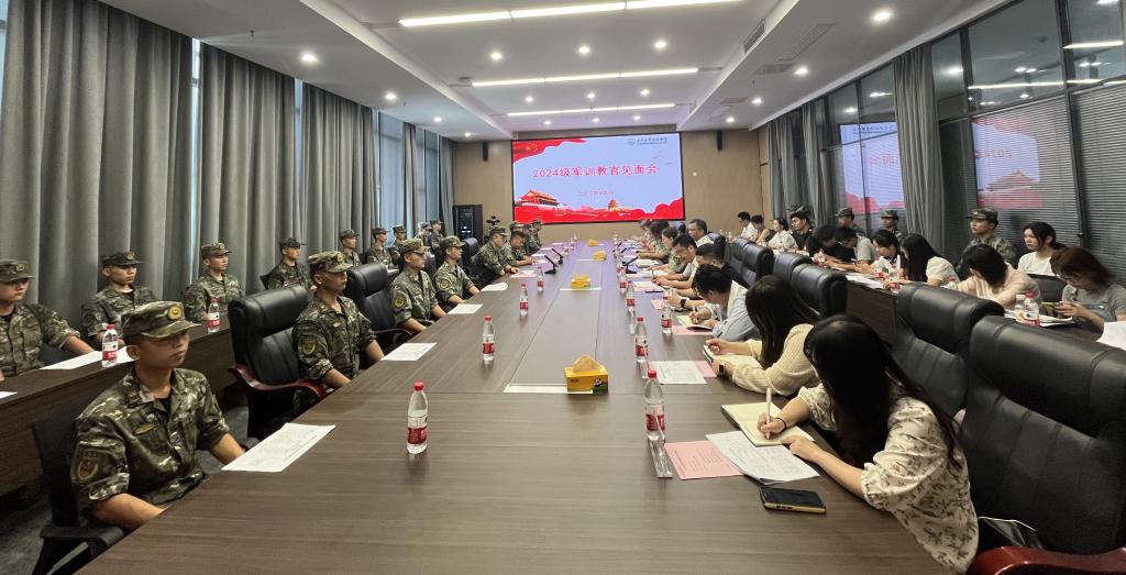 9月8日下午,在图书馆512会议室举行2024级本、专科新生军训教官见面会。公司领导公司党委副书记李则俊,党委员工工作部部长李刚英、副部长王琳,武警荆州支队作训参谋王浩、队管参谋刘畅,全体带训教官、新生辅导员、员工工作部相关工作人员参加会议。