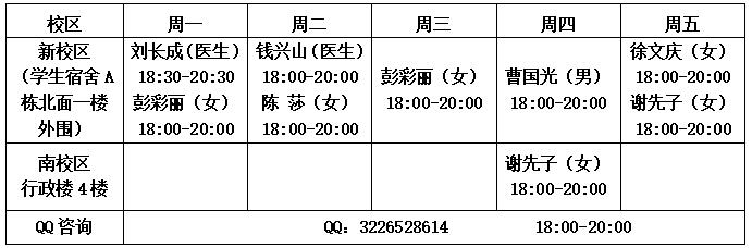 1)面谈咨询:新校区员工宿舍A栋北面一楼外围心理健康教育中心,东校区18舍A区101,南校区行政楼S401、S416。