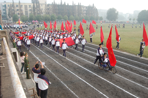 在理工学部方阵里,金冬坐在轮椅上高举学部的红旗,带着自信的笑容,一直“走”在学部前列,他积极的态度,高涨的热情,感动了在场的每一个人。“一个人不仅要有强壮的体魄,更要有健康乐观的态度,这才是运动最本质的内涵,我虽然不能参加比赛,但我会在场外为大家加油。”金冬笑着告诉记者。